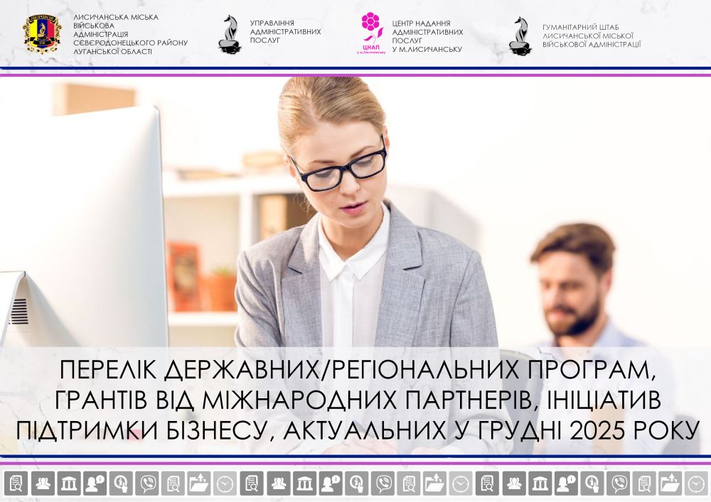 З метою надання консультаційної допомоги та підтримки суб’єктам малого і середнього підприємництва у співпраці з Департаментом економічного розвитку та зовнішньоекономічної діяльності Луганської облдержадміністрації надаємо Перелік державних/регіональних програм, грантів від міжнародних партнерів, ініціатив підтримки бізнесу, актуальних у грудні 2025 року.