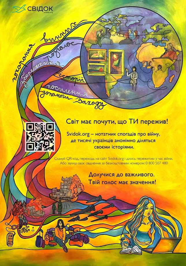 Онлайн-платформа «Свідок» (https://svidok.org/) створена для того, щоб українці могли анонімно зберегти свої спогади про війну, розповісти про пережите, зафіксувати факти воєнних злочинів і залишити правду для майбутніх поколінь.